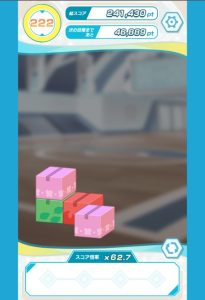 まずルールとしては、沢山積まれた箱を4個ずつ消していくというものです。ただし全て同じ色か全てバラバラの色(4色消し)でないと消せません。同色消しはスコアが貯まっていきますが、スコア倍率は上がりにくいです。4色消しはスコアにならない代わりに今後のスコア倍率が大幅にアップします。つまり序盤はなるべく4色消しを行い、終盤は同色消しを重ねてスコアを伸ばすのが基本です。ポケマスで初回はサポートがB技を撃ってボルテージを上げるのと同じですね。