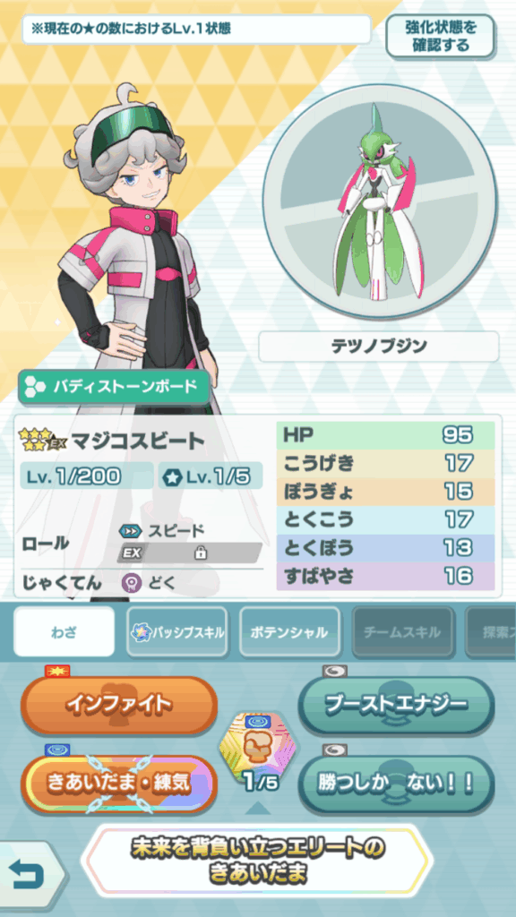 タワーの場合は手持ちの層が薄いタイプを穴埋めできるバディーズを選びたいです。たとえば自分の場合は手持ちに特殊格闘アタッカーがほぼいないためマジコスビートを補強すれば戦力の底上げになります。